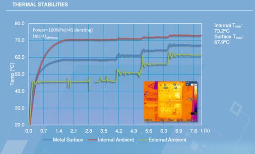 代表機型2:S廠商逆變器。逆變器內(nèi)部溫度比機箱外殼溫度高15度左右,在環(huán)境溫度45度條件下,內(nèi)部溫度約70度;