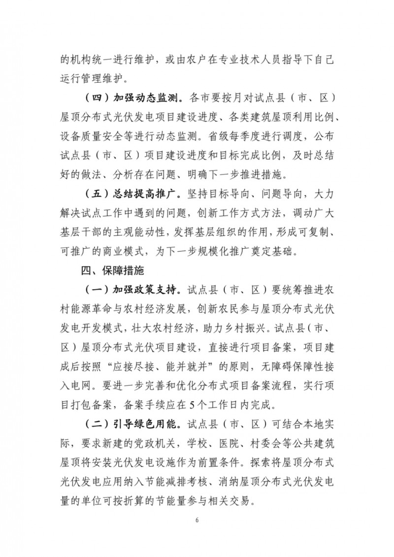 為促進(jìn)我省整縣屋頂分布式光伏項(xiàng)目建設(shè),省級將建立按月調(diào)度機(jī)制,對試點(diǎn)地區(qū)各類屋頂分布式光伏發(fā)電項(xiàng)目備案、開工、建設(shè)和并網(wǎng)情況等進(jìn)行全過程監(jiān)測,按季度公布相關(guān)信息。非試點(diǎn)縣(市、區(qū))要按既有相關(guān)政策規(guī)定繼續(xù)開展各類屋頂分布式光伏發(fā)電項(xiàng)目開發(fā)建設(shè)。2023年底前,試點(diǎn)縣(市、區(qū))各類屋頂安裝光伏發(fā)電的比例均達(dá)到國家相關(guān)要求的,我委將申請列為國家整縣(市、區(qū))屋頂分布式光伏開發(fā)示范縣。試點(diǎn)中發(fā)現(xiàn)的亮點(diǎn)和存在的突出問題,請及時(shí)報(bào)送我委。
