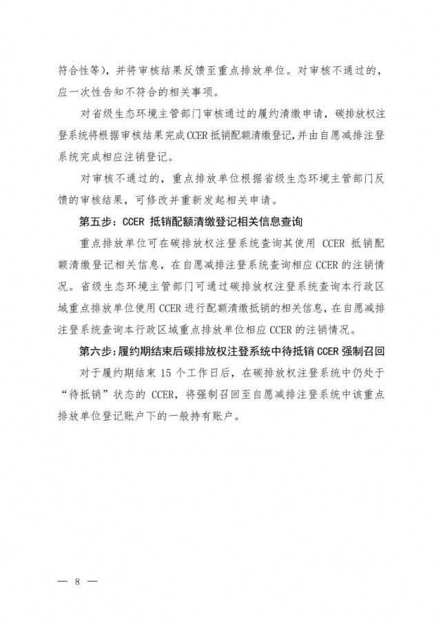 組織有意愿使用CCER抵銷碳排放配額清繳的重點排放單位抓緊開立賬戶,盡快完成CCER購買并申請抵銷,抵銷比例不超過對應年度應清繳配額量的5%。對第一個履約周期出于履約目的已注銷但實際未用于抵銷清繳的CCER,由重點排放單位申請,可用于抵銷2021、2022年度配額清繳。
