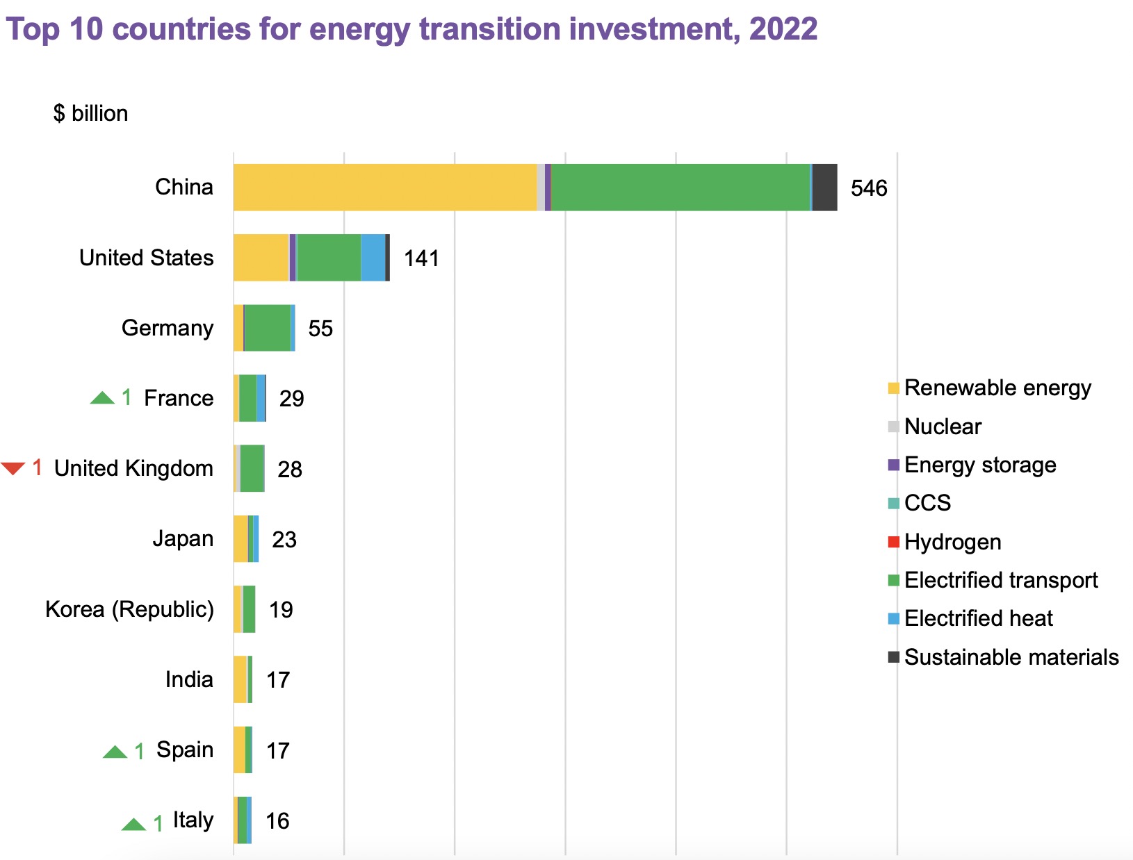 2022年能源轉(zhuǎn)型投資排名前10的國家,中國大幅領(lǐng)先,占全球投資總額近半