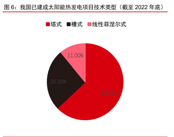 我國已建成光熱項目中,塔式光熱占比相對較高。根據(jù) CSTA 數(shù)據(jù),截至 2021 年底, 全球太陽能熱發(fā)電累計裝機容量達到 6.8GW,槽式、塔式、線性菲涅耳技術裝機在全球主 要國家和地區(qū)的占比為 76%、20%和 4%。截至 2022 年底,我國太陽能熱發(fā)電累計裝機 容量為 588MW(含 MW 級以上規(guī)模的發(fā)電系統(tǒng)),塔式光熱電站雖然前期系統(tǒng)建設一次性投資較大且維護成本較高,但更適合我國西部地區(qū)晝夜溫差大、缺少水資源、自然環(huán)境 惡劣等特點,同時因槽式系統(tǒng)和線菲式系統(tǒng)集熱效率偏低、對工質加熱能力較弱等因素, 因而在我國塔式光熱電站應用范圍相對較廣。
