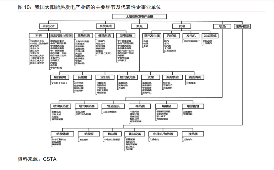 光熱發(fā)電產業(yè)鏈體系可分為研發(fā)、設計、制造、安裝等環(huán)節(jié),產業(yè)鏈國產化程度較高。 根據(jù) CSTA 數(shù)據(jù)顯示,在國家第一批光熱發(fā)電示范項目中,設備、材料國產化率超過 90%, 技術及裝備的可靠性和先進性在電站投運后得到有效驗證;在青海中控德令哈 50MW 塔 式光熱發(fā)電項目中,設備和材料國產化率已達到 95%以上。