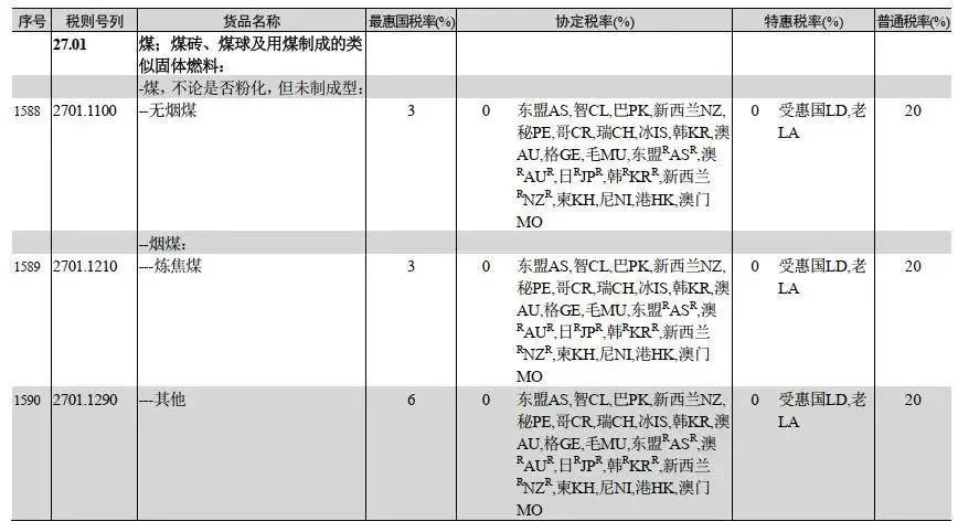 稅則顯示,2024年1月1日起,恢復(fù)煤炭進口關(guān)稅。普通稅率為20%;特惠稅率為0;協(xié)定稅率基本為0;最惠國稅率中,無煙煤、煉焦煤、褐煤為3%,其他煤為6%。