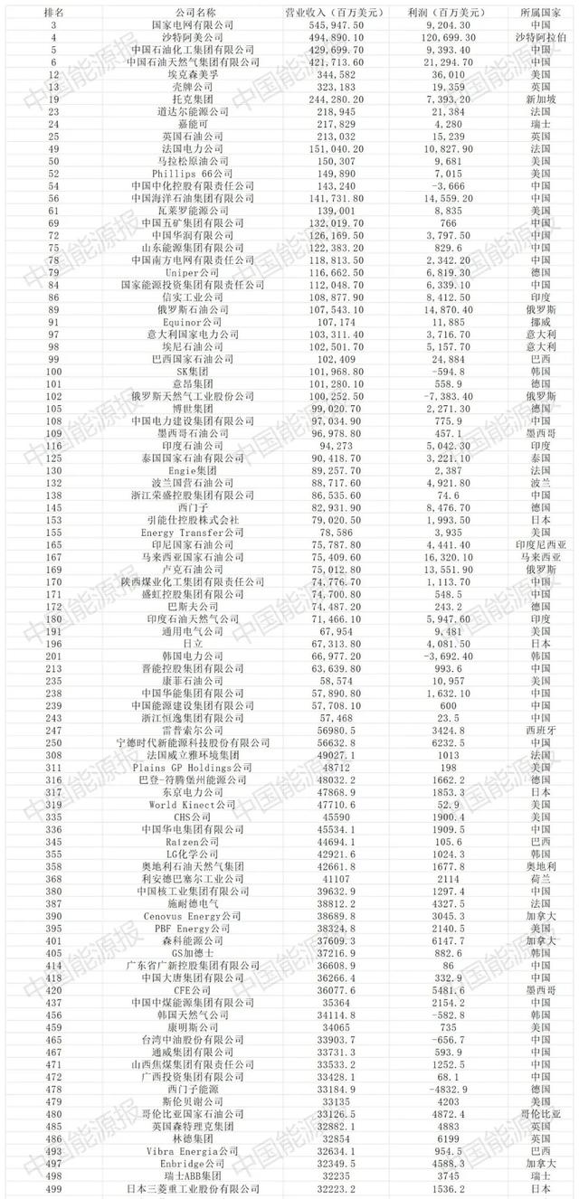 在排名前100的企業(yè)中,共有29家能源企業(yè),中國能源企業(yè)占據(jù)10家,比例超過1/3。