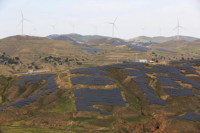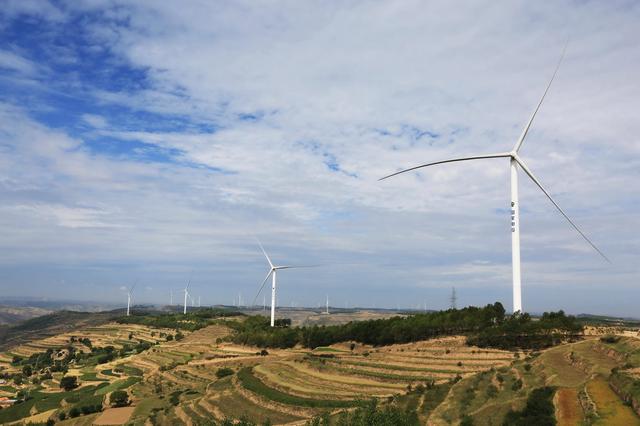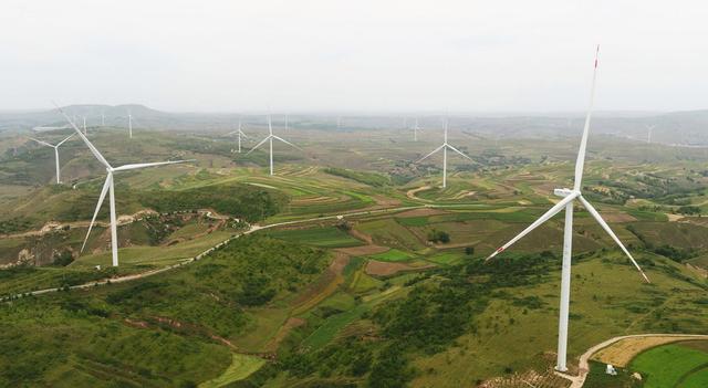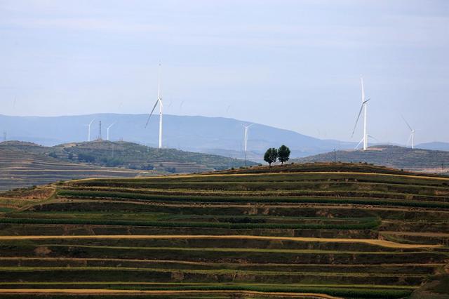 夏日時(shí)節(jié),在位于黃土高原的甘肅省定西市,風(fēng)電基地風(fēng)機(jī)迎風(fēng)旋轉(zhuǎn),與梯田、村莊相映成景,蔚為壯觀。