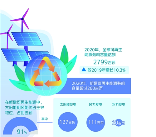 總部位于阿聯酋首都阿布扎比的國際可再生能源署(IRENA)近日發(fā)布報告《可再生能源裝機容量數據2021》。報告稱,2020年,全球可再生能源裝機容量達到2799吉瓦,較2019年增長10.3%;新增可再生能源裝機容量超過260吉瓦。