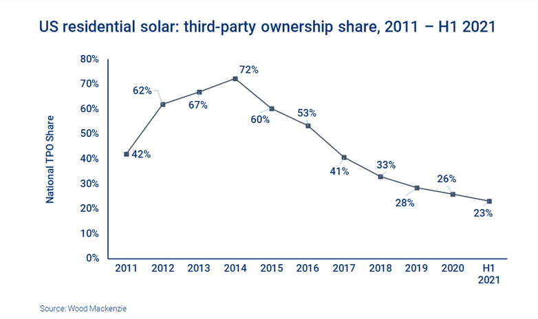 近年來,光伏行業(yè)貸款的增長顯著超過了整體戶用光伏市場的增長。這導(dǎo)致第三方所有權(quán)(TPO)的新項目份額下降。事實上,TPO份額已從2020年的26%下降到2021年上半年的23%,這是有記錄以來的最低水平。與此同時,貸款份額在同一時期從55%增加到60%。低利率的長期貸款(25年期,利率為3%或更低)繼續(xù)為客戶提供資金支持,并推動市場增長。