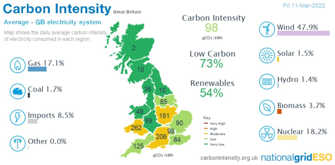 據(jù)英國國家電網(wǎng)數(shù)據(jù),2022年3月11日(星期五)風(fēng)力發(fā)電占英國電力的47.9%,其次是核能18.2%,天然氣17.1%,進口電力8.5%,生物質(zhì)3.7%,煤炭1.7%,太陽能1.5%,水力1.4%。