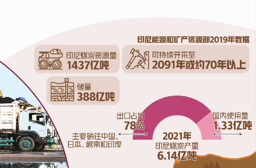 根據(jù)印尼能源和礦產(chǎn)資源部2019年數(shù)據(jù),印尼煤炭資源量為1437億噸,儲量為388億噸,可以持續(xù)開采到2091年或大約70年以上。2021年,印尼煤炭產(chǎn)量達(dá)到6.14億噸,而國內(nèi)使用量僅為1.33億噸,78%用于出口,是世界上動力煤出口量最大的國家,主要銷往中國、日本、越南和印度。