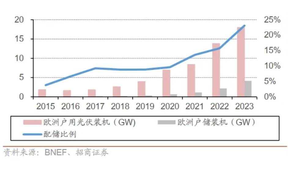 圖:歐洲戶(hù)用光儲(chǔ)裝機(jī)及配儲(chǔ)比例