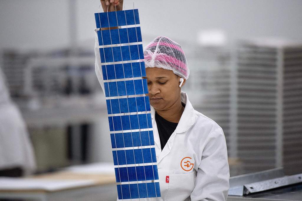 當?shù)貢r間2023年10月25日,南非開普敦,一名婦女在只有女性員工的太陽能電池板工廠“非洲能源”檢查組件。