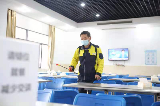 國網(wǎng)重慶璧山供電公司物業(yè)人員對員工食堂進行消毒殺菌