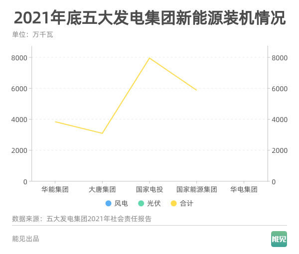 從折線斜率可以清晰看出,只有國家能源集團2021年新增裝機量高于2020年,華能、大唐、國家電投三家則2021年增量低于2020年,華電缺失數(shù)據(jù)(僅發(fā)布新聞,未發(fā)布完整版報告)。
