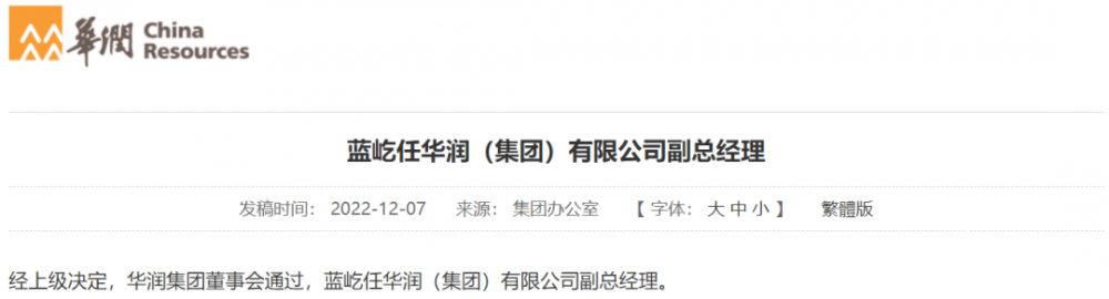 12月7日,經(jīng)上級決定,華潤集團董事會通過,藍屹任華潤(集團)有限公司副總經(jīng)理。