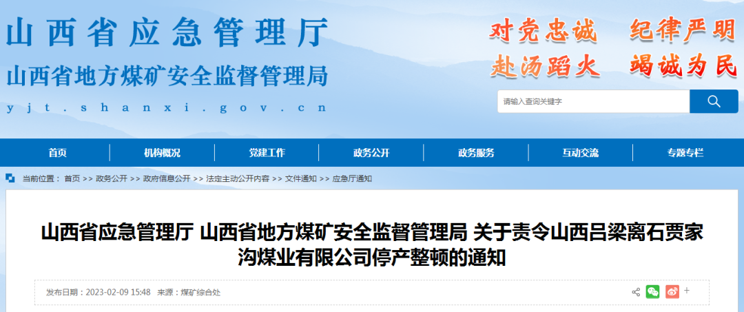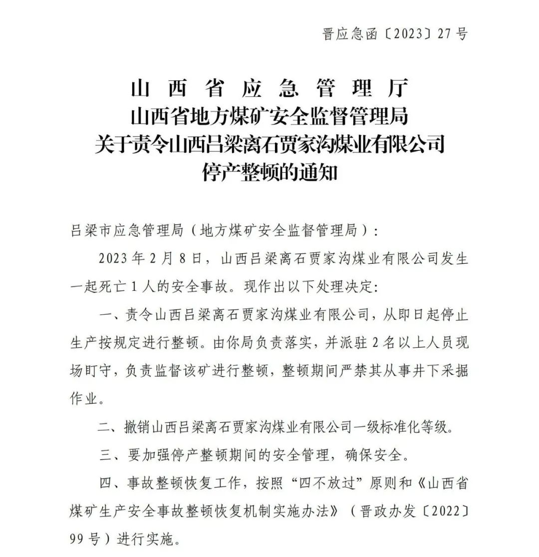 2月9日,山西省應(yīng)急管理廳、山西省地方煤礦安全監(jiān)督管理局下發(fā)通知,責(zé)令山西呂梁離石賈家溝煤業(yè)有限公司停產(chǎn)整頓。