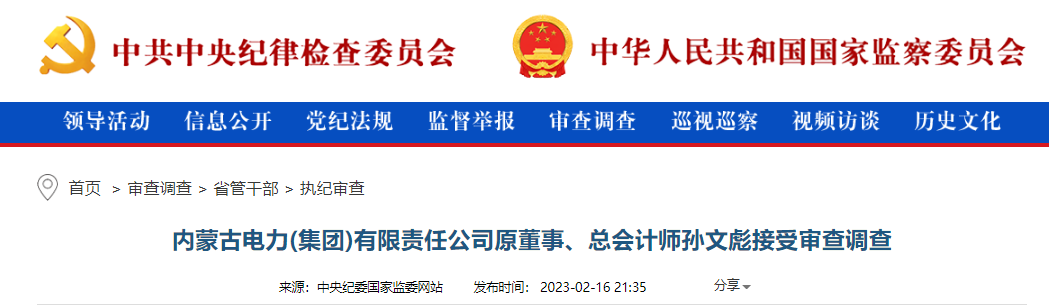 中央紀委國家監(jiān)委網(wǎng)站2月16日消息,據(jù)內(nèi)蒙古自治區(qū)紀委監(jiān)委消息:內(nèi)蒙古電力(集團)有限責任公司原董事、總會計師孫文彪涉嫌嚴重違紀違法,目前正接受內(nèi)蒙古自治區(qū)紀委監(jiān)委紀律審查和監(jiān)察調查。