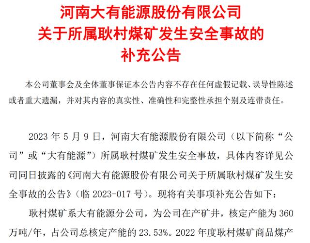 公告顯示,耿村煤礦系大有能源分公司,為公司在產(chǎn)礦井,核定產(chǎn)能為 360 萬噸/年,占公司總核定產(chǎn)能的 23.53%。2022 年度耿村煤礦商品煤產(chǎn) 量 287.45 萬噸,營業(yè)收入 13.22 億元,分別占公司同期商品煤產(chǎn)量 的 24.83%和營業(yè)收入的 15.39%。2023 年第一季度耿村煤礦商品煤產(chǎn) 量 51.51 萬噸,營業(yè)收入 2.15 億元,分別占公司同期商品煤產(chǎn)量的 18.32%和營業(yè)收入的 10.73%。目前,耿村煤礦正在組織實施停產(chǎn)救援,對公司造成的影響暫無法預測。公司將持續(xù)關(guān)注事故后續(xù)進展并及時履行信息披露義務,敬請廣大投資者注意投資風險。