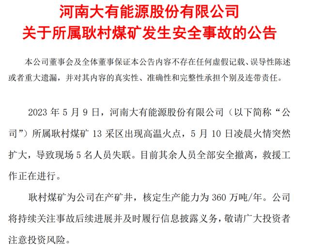 突發(fā)!大有能源公告火情事故,5人失聯(lián)