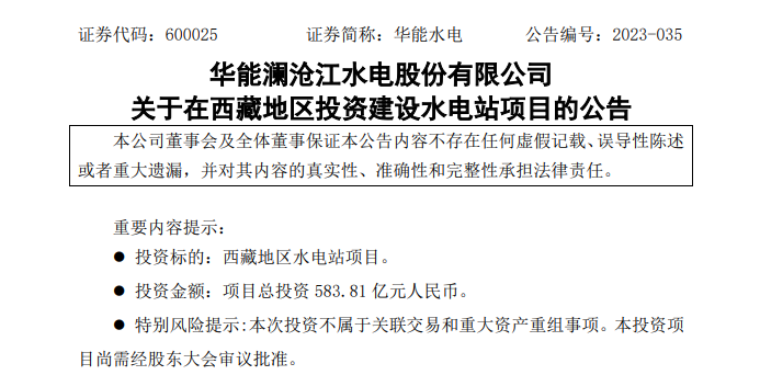 華能水電5月30日晚間公告,公司擬在西藏地區(qū)投資建設(shè)水電站項(xiàng)目,項(xiàng)目裝機(jī)容量260萬千瓦,多年平均發(fā)電量112.81億千瓦時,工程總工期132個月(不含籌建期),按2022年三季度價(jià)格水平計(jì)算,工程總投資583.81億元。