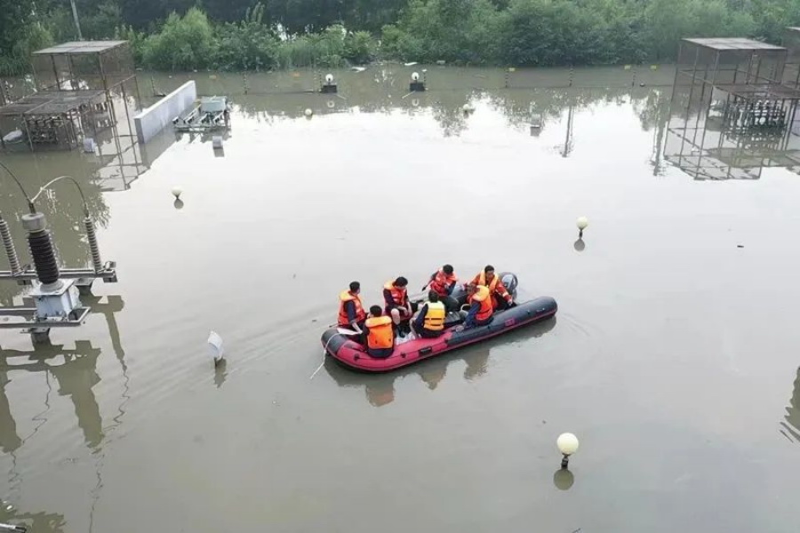 防汛搶險(xiǎn)黨員突擊隊(duì)隊(duì)員乘沖鋒舟進(jìn)入受損變電站進(jìn)行勘察