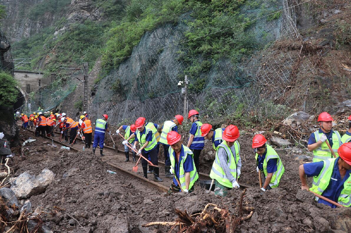 7月30日,受北京特大暴雨影響,三輛列車受困??吭诒本╅T頭溝妙峰山鎮(zhèn)山區(qū)。由于交通完全阻隔,災(zāi)情仍在持續(xù),現(xiàn)場(chǎng)救援刻不容緩。8月1日晚上9點(diǎn)半,接上級(jí)通知,中鐵十四局京唐、石港、雄商、雄忻、津滄等北京周邊項(xiàng)目共275人連夜趕赴北京門頭溝搶險(xiǎn)一線,搶修被山體沖刷的淤泥、樹(shù)根、巨石覆蓋的鐵路路基,為受困列車旅客拉通逃生通道。