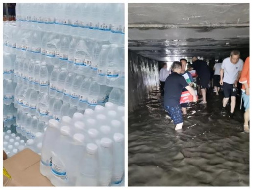 中化局物資籌措隊在涿州市分散采購礦泉水、干糧、充電寶、蠟燭等急需物資,密切關(guān)注交通運(yùn)輸路況信息,第一時間打通物資通道。黨員干部和志愿者組成“人鏈”,手抱肩扛運(yùn)送保障物資,搶時間、不停歇,保證基地群眾特別是離退休老職工家庭飲用水。