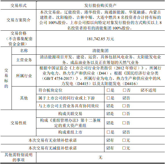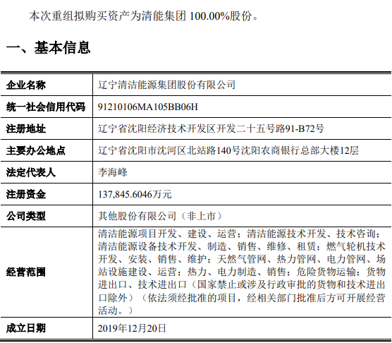 根據(jù)此前公告披露,遼寧能源擬作價(jià)18.17億元,以發(fā)行股份的方式收購(gòu)遼能投資、港華投資、海通新能源等共8名投資者合計(jì)持有的遼寧清潔能源集團(tuán)(簡(jiǎn)稱:清能集團(tuán))100%股份,并募集配套資金10億元,用于遼能康平300MW風(fēng)電項(xiàng)目、遼能南票200MW風(fēng)電項(xiàng)目、償還上市公司債務(wù)。