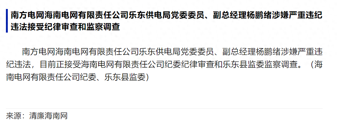 南方電網(wǎng)高層驚現(xiàn)腐敗風(fēng)暴!樂東供電局黨委委員、副總經(jīng)理?xiàng)铢i緒涉嫌違紀(jì)違法,正接受紀(jì)委和監(jiān)委的雙重調(diào)查!