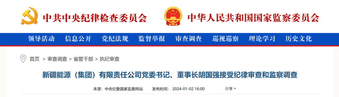據(jù)中央紀委國家監(jiān)委網(wǎng)站1月2日消息,據(jù)新疆維吾爾自治區(qū)紀委監(jiān)委消息:新疆能源(集團)有限責(zé)任公司黨委書記、董事長胡國強涉嫌嚴重違紀違法,目前正接受新疆維吾爾自治區(qū)紀委監(jiān)委紀律審查和監(jiān)察調(diào)查。