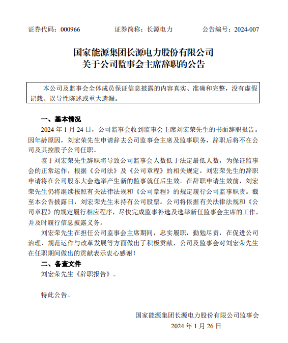 1月26日,長(zhǎng)源電力發(fā)布公告稱,1月24日,公司監(jiān)事會(huì)收到監(jiān)事會(huì)主席劉宏榮先生的書面辭職報(bào)告。因年齡原因,劉宏榮先生申請(qǐng)辭去公司監(jiān)事會(huì)主席及監(jiān)事職務(wù),辭職后將不在公司及其控股子公司任職。