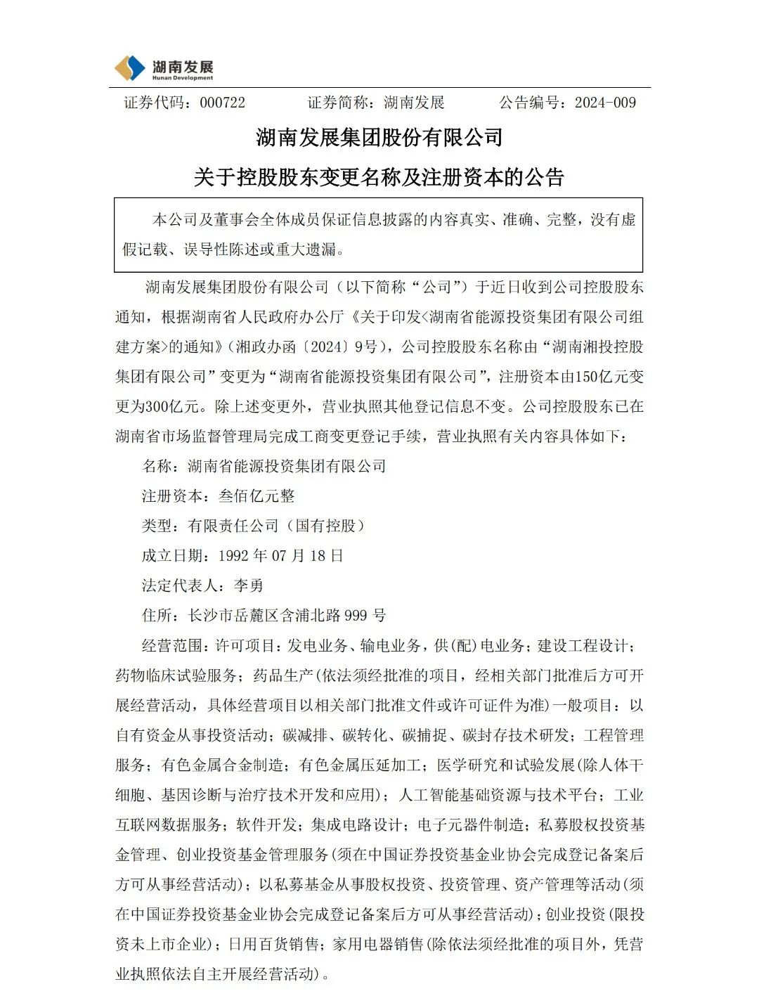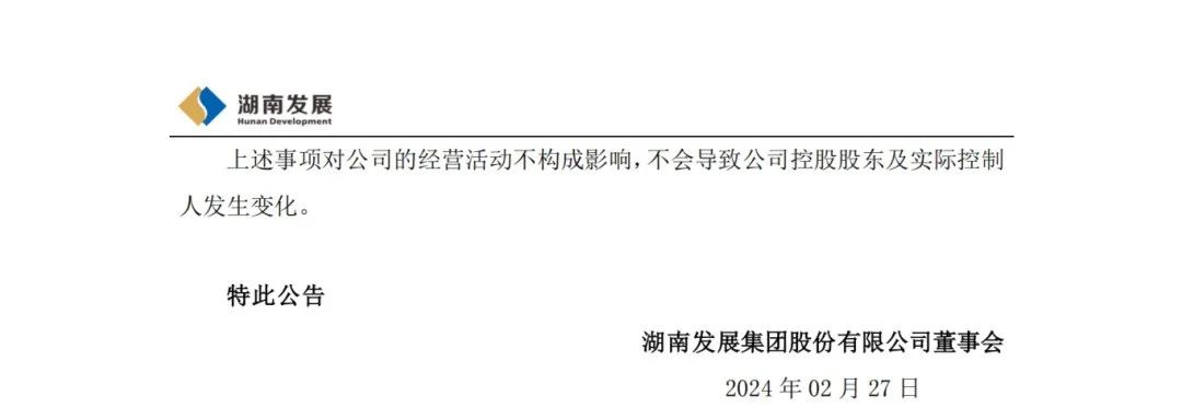2月27日,湖南發(fā)展集團股份有限公司發(fā)布關(guān)于控股股東變更名稱及注冊資本的公告,公告顯示:湖南發(fā)展集團股份有限公司于近日收到公司控股股東通知,根據(jù)湖南省人民政府辦公廳《關(guān)于印發(fā)<湖南省能源投資集團有限公司組建方案>的通知》(湘政辦函〔2024〕9號),公司控股股東名稱由“湖南湘投控股集團有限公司”變更為“湖南省能源投資集團有限公司”,注冊資本由150億元變更為300億元。除上述變更外,營業(yè)執(zhí)照其他登記信息不變。公司控股股東已在湖南省市場監(jiān)督管理局完成工商變更登記手續(xù)。