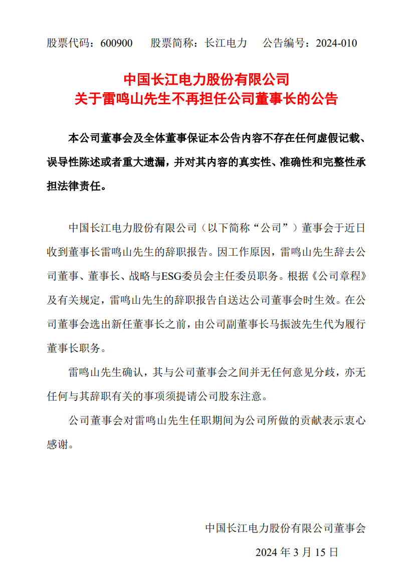 3月15日,長江電力發(fā)布公告稱,公司董事會于近日收到董事長雷鳴山先生的辭職報告。因工作原因,雷鳴山先生辭去公司董事、董事長、戰(zhàn)略與ESG委員會主任委員職務。