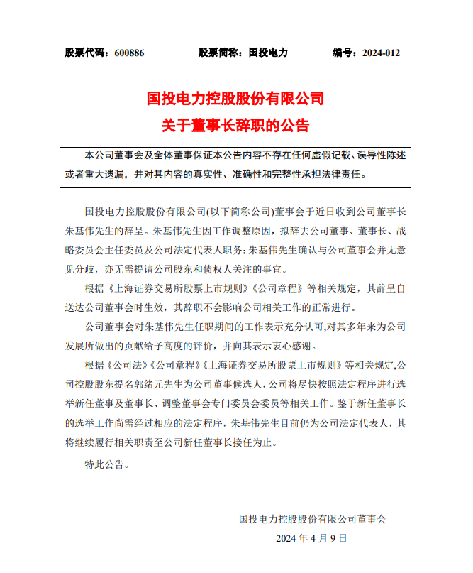 4月9日,國投電力發(fā)布公告稱,公司董事會于近日收到公司董事長朱基偉先生的辭呈。朱基偉先生因工作調整原因,擬辭去公司董事、董事長、戰(zhàn)略委員會主任委員及公司法定代表人職務;朱基偉先生確認與公司董事會并無意見分歧,亦無需提請公司股東和債權人關注的事宜。