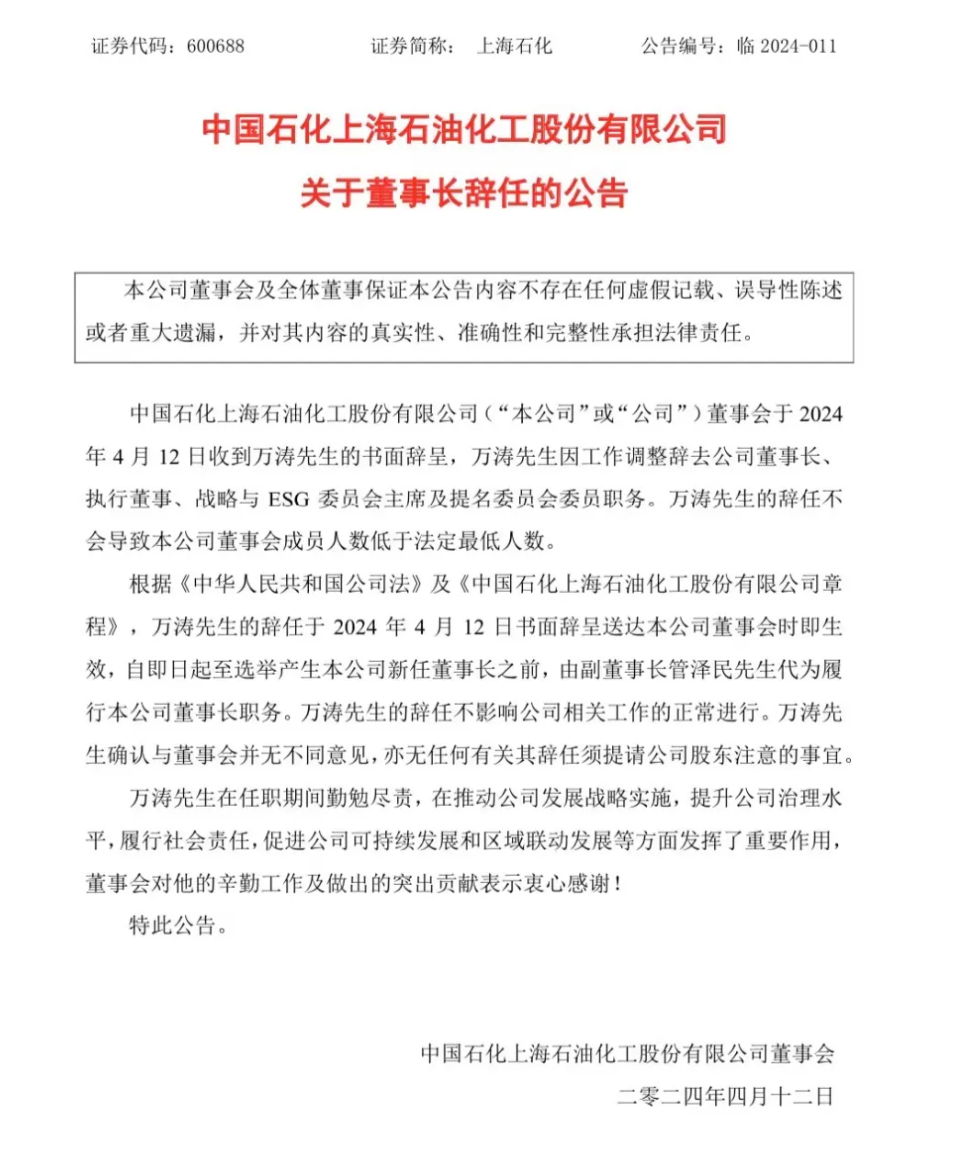上海石化發(fā)布公告稱,公司董事會(huì)4月12日收到萬(wàn)濤先生的書面辭呈,萬(wàn)濤先生因工作調(diào)整辭去公司董事長(zhǎng)、執(zhí)行董事、戰(zhàn)略與 ESG 委員會(huì)主席及提名委員會(huì)委員職務(wù) 。