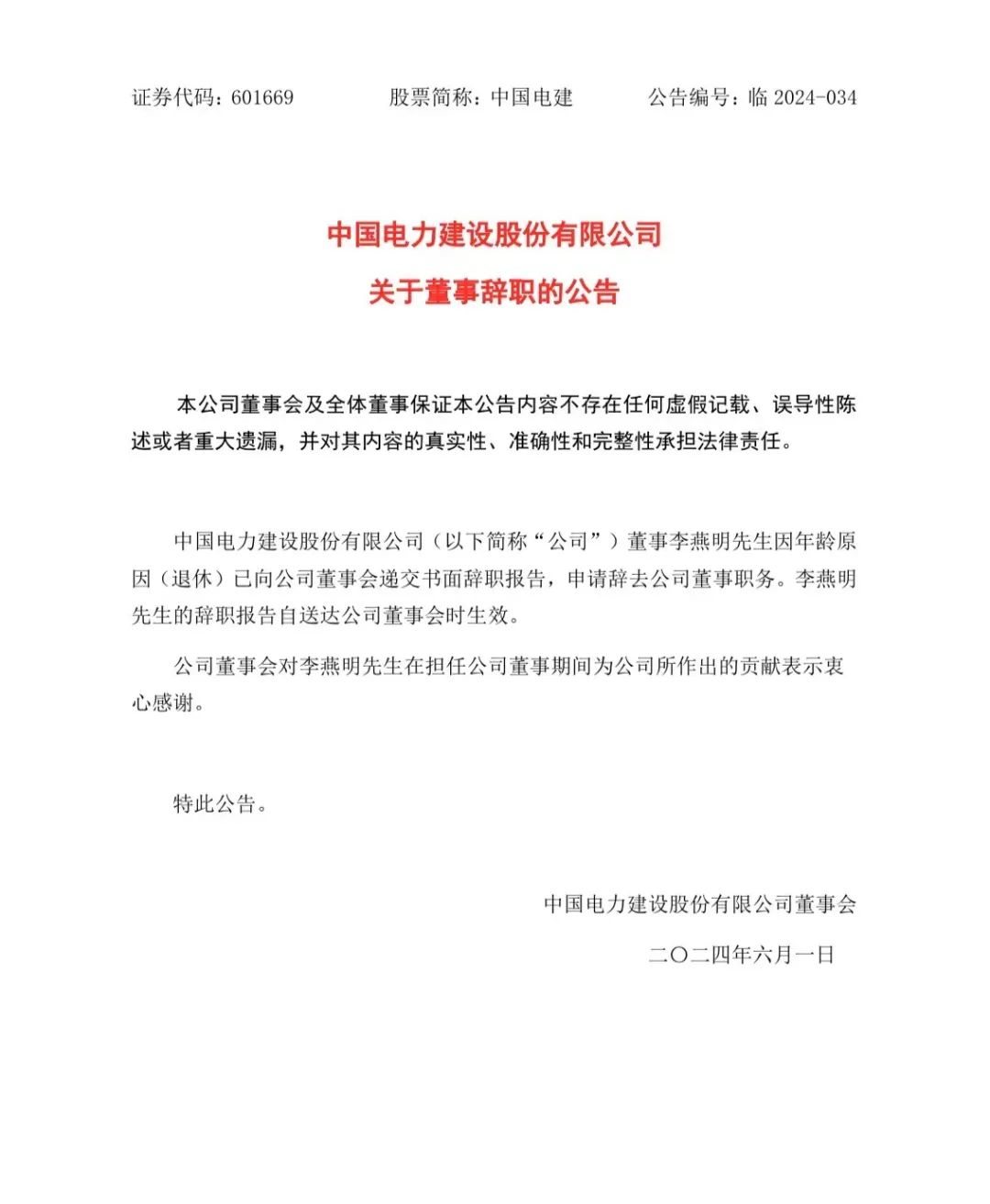 6月1日,中國電建發(fā)布公告稱,公司董事李燕明先生因年齡原因(退休)已向公司董事會遞交書面辭職報告,申請辭去公司董事職務。李燕明先生的辭職報告自送達公司董事會時生效。