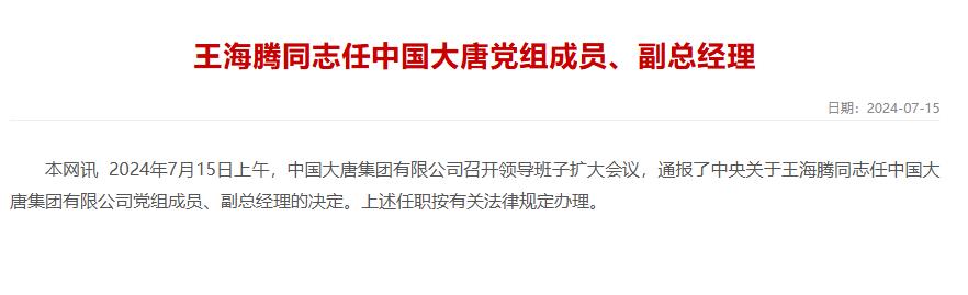 據(jù)大唐集團(tuán)官網(wǎng)消息,2024年7月15日上午,中國大唐集團(tuán)有限公司召開領(lǐng)導(dǎo)班子擴(kuò)大會(huì)議,通報(bào)了中央關(guān)于王海騰同志任中國大唐集團(tuán)有限公司黨組成員、副總經(jīng)理的決定。上述任職按有關(guān)法律規(guī)定辦理。