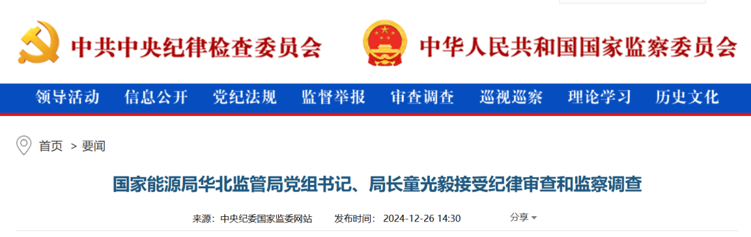 中央紀委國家監(jiān)委網(wǎng)站12月26日消息,據(jù)中央紀委國家監(jiān)委駐國家發(fā)展改革委紀檢監(jiān)察組、內蒙古自治區(qū)紀委監(jiān)委消息:國家能源局華北監(jiān)管局黨組書記、局長童光毅涉嫌嚴重違紀違法,目前正接受中央紀委國家監(jiān)委駐國家發(fā)展改革委紀檢監(jiān)察組紀律審查和內蒙古自治區(qū)包頭市監(jiān)察委員會監(jiān)察調查。
