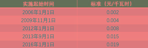 表3:可再生能源電價附加征收標(biāo)準(zhǔn)歷年變化(單位:元/千瓦時)
