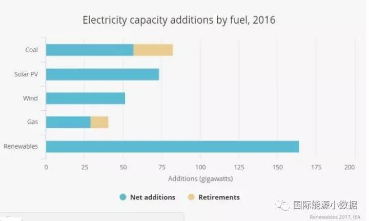 國(guó)際能源署發(fā)布2017年可再生能源報(bào)告,確認(rèn)2016年全球新增可再生能源裝機(jī)165吉瓦,其中太陽(yáng)能光伏裝機(jī)達(dá)到74吉瓦(約46%來(lái)自中國(guó)),首次超過(guò)煤電新增裝機(jī)(57吉瓦)。