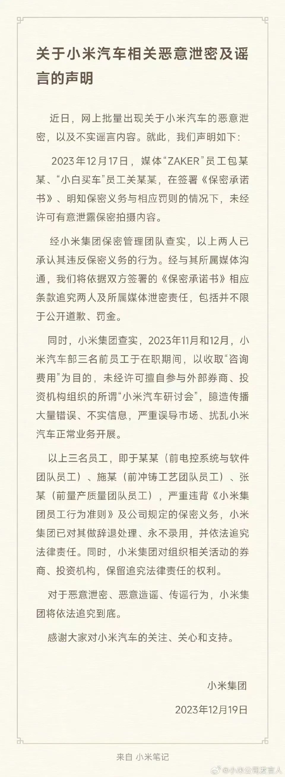 12月19日晚,小米科技有限責任公司官方微博“小米公司發(fā)言人”發(fā)布了《關于小米汽車相關惡意泄密及謠言的聲明》。小米表示,將追究2名媒體人的泄密責任,同時,對3名擅自參與外部機構所謂“小米汽車研討會”、臆造傳播大量錯誤不實信息誤導市場的前員工進行辭退處理、永不錄用,并依法追究法律責任。