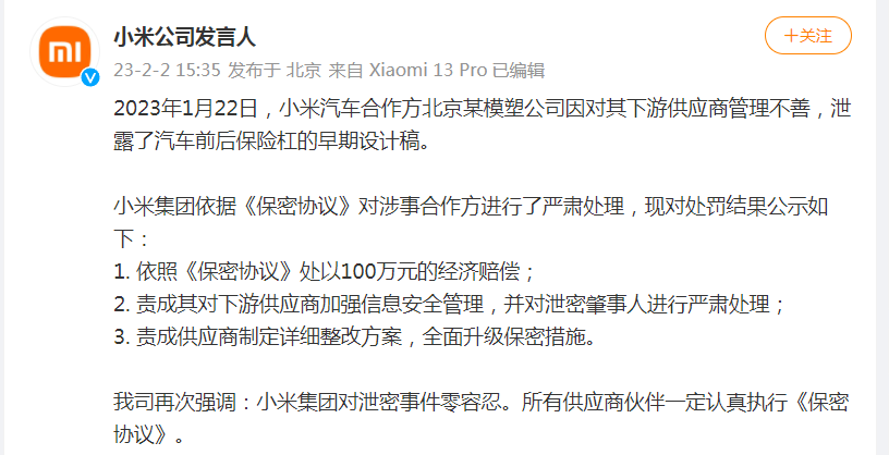 《聲明》稱,2023年12月17日,媒體“ZAKER”員工包某某、“小白買車”員工關某某,在簽署《保密承諾書》、明知保密義務與相應罰則的情況下,未經許可有意泄露保密拍攝內容。經小米集團保密管理團隊查實,以上兩人已承認其違反保密義務的行為。經與其所屬媒體溝通,小米集團將依據雙方簽署的《保密承諾書》相應條款追究兩人及所屬媒體泄密責任,包括并不限于公開道歉、罰金。另外,《聲明》介紹,2023年11月和12月,小米汽車部三名前員工于在職期間,以收取“咨詢費用”為目的,未經許可擅自參與外部券商、投資機構組織的所謂“小米汽車研討會”,臆造傳播大量錯誤、不實信息,嚴重誤導市場、擾亂小米汽車正常業(yè)務開展。以上三名員工,即于某某(前電控系統(tǒng)與軟件團隊員工)、施某(前沖鑄工藝團隊員工)、張某(前量產質量團隊員工),嚴重違背《小米集團員工行為準則》及公司規(guī)定的保密義務,小米集團已對其做辭退處理、永不錄用,并依法追究法律責任。同時,小米集團表示,對組織相關活動的券商、投資機會,保留追究法律責任的權利。小米汽車始終吸引市場高度關注,這也不是小米集團第一次遭遇汽車泄密。今年1月22日,小米汽車合作方北京某模塑科技有限公司因對其下游供應商管理不善,泄露了小米汽車前后保險杠的早期設計稿。“小米公司發(fā)言人”微博今年2月更新了該泄密事件的處理結果:小米集團表示,已依據《保密協(xié)議》對涉事合作方進行了嚴肅處理,包括依照《保密協(xié)議》處以100萬元的經濟賠償;責成其對下游供應商加強信息安全管理,并對泄密肇事人進行嚴肅處理;責成供應商制定詳細整改方案,全面升級保密措施。