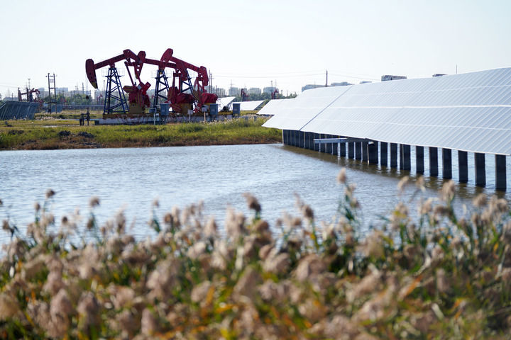 2023年9月19日,在黑龍江大慶油田星火水面光伏電站,電站設(shè)施與附近的抽油機相映成趣。新華社記者 王建威 攝