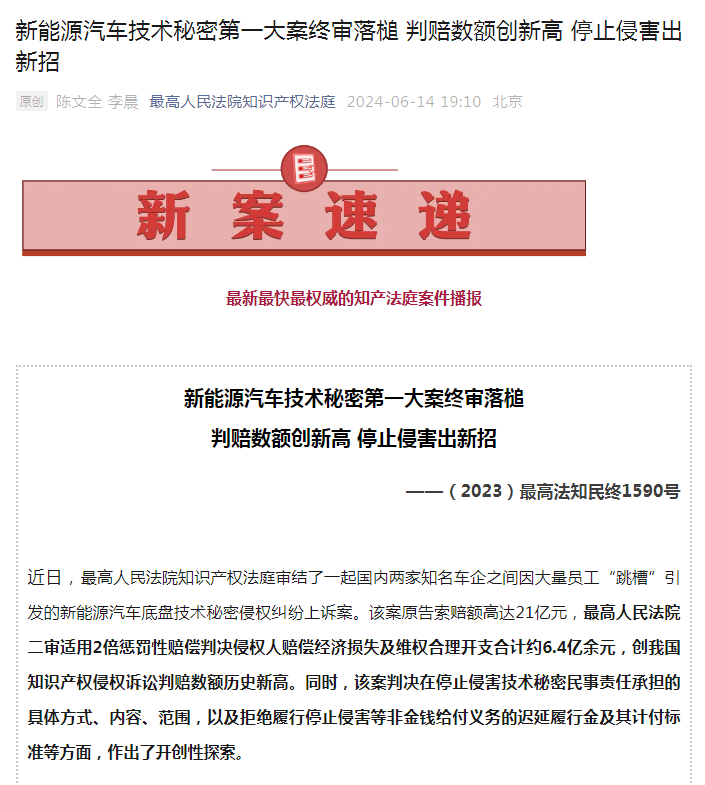 北京歷時6年,吉利起訴威馬竊取商業(yè)機密和技術(shù)侵權(quán)案件近日終審落槌。據(jù)最高人民法院知識產(chǎn)權(quán)法庭發(fā)布的《(2023)最高法知民終1590號新能源汽車底盤技術(shù)秘密侵權(quán)案民事判決書》顯示,原告吉利方勝訴,威馬方敗訴需賠償吉利方6.4億余元,創(chuàng)我國知識產(chǎn)權(quán)侵權(quán)訴訟判賠數(shù)額歷史新高。