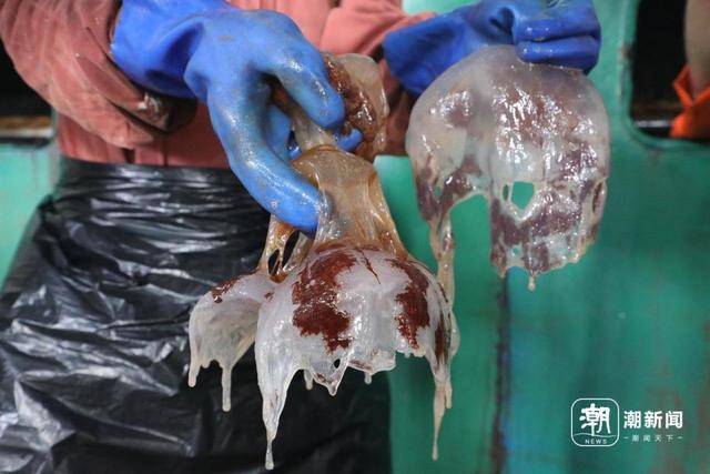 “我平常在辦公室工作的,今天第一次來抓海蜇,上午從8點半站到下午1點半,已經(jīng)抓了10袋。”一位工人告訴記者,他是第一次抓海蜇,濾網(wǎng)上的海蜇大的能有2斤重,抓摘手法不能太重也不能太輕,力氣大了海蜇碎掉,更不好清理。