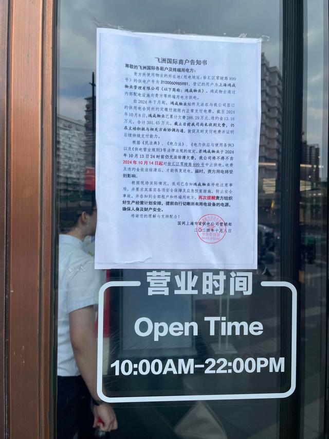 不過,在該商場(chǎng)門口、電梯口等多處地方都貼上了告示,上面寫著:自2024年7月起,鴻成物業(yè)無法在供電合同所約定繳付期限內(nèi)正常支付電費(fèi)。截至2024年10月8日,鴻成物業(yè)已累計(jì)欠費(fèi)288.29萬元、違約金13.16萬元,合計(jì)301.45萬元。若鴻成物業(yè)于2024年10月13日24時(shí)前仍無法結(jié)清欠費(fèi),國(guó)網(wǎng)上海市南供電公司不得不自2024年10月14日起,對(duì)零陵路899號(hào)中止供電。