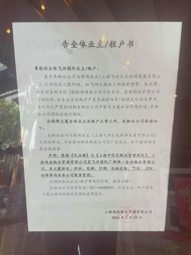值得注意的是,鴻成物業(yè)與飛洲文旅此前已經(jīng)存在經(jīng)濟(jì)糾紛。記者辦公樓下看到,鴻成物業(yè)7月19日發(fā)布了一份“告全體業(yè)主/租戶書”,上面寫著,鴻成物業(yè)與飛洲文旅之間存在欠款糾紛,如飛洲文旅拖欠物業(yè)費(fèi)、能耗費(fèi),并拒絕支付相關(guān)費(fèi)用,鴻成物業(yè)將進(jìn)行依法維權(quán)。