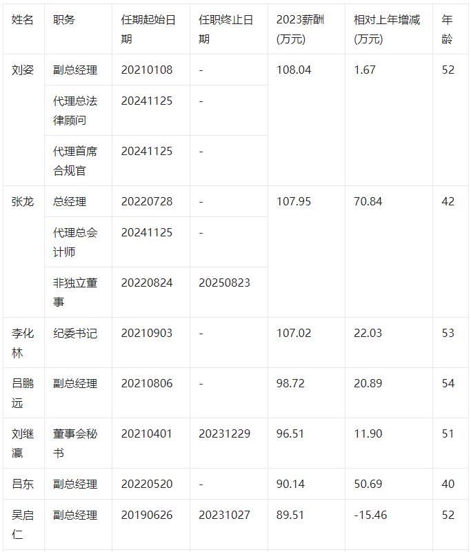 根據(jù)2023年報(bào)數(shù)據(jù),剔除獨(dú)立董事、監(jiān)事會主席、監(jiān)事后,三峽能源共有13位董事和高級管理人員。從年齡看,三峽能源董事和高級管理人員平均年齡為50.23歲,年齡中位數(shù)為52歲,其中,非獨(dú)立董事蔡庸忠年齡最高為62歲,副總經(jīng)理呂東年齡最小為40歲。從薪酬看,董事和高級管理人員合計(jì)領(lǐng)取報(bào)酬904.35萬元,平均薪酬86.18萬元,年薪中位數(shù)為98.72萬元。其中,副總經(jīng)理、代理總法律顧問及代理首席合規(guī)官劉姿薪酬最高為108.04萬元,非獨(dú)立董事蔡庸忠薪酬最低為6.00萬元(2023年任期不滿1年的不參與統(tǒng)計(jì))。