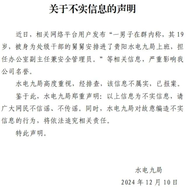 男子稱(chēng)19歲被舅舅安排任辦公室副主任?水電九局聲明:信息不實(shí),已報(bào)案。