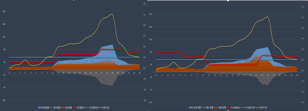 當(dāng)市場來臨的時候,部分國有發(fā)電企業(yè)的經(jīng)營模式并沒有調(diào)整到位,可能存在經(jīng)營決策失誤的原因。例如,中長期簽約時未充分考慮自身節(jié)點(diǎn)和用戶側(cè)現(xiàn)貨價格的差異,不同發(fā)電企業(yè)、不同用戶一個策略,簡單粗暴,不管簽?zāi)牡挠脩舳际且粋€價,只重視合同價格的高低,不考慮價差電費(fèi)的高低,有些甚至不在合同中約定分時價格。如圖4所示,左圖與右圖用戶電量相同,左圖用戶合同價為0.4元/度,右圖用戶合同價為0.3元/度,兩個用戶用電曲線形狀不同,其他均相同。從大烏海區(qū)域部分電源的選擇來看,顯然更喜歡左圖用戶,然而事實(shí)卻告訴我們:由于右圖用戶價差電費(fèi)要遠(yuǎn)高于左圖用戶的價差電費(fèi),最終的結(jié)算結(jié)果是合同價低25%的右圖用戶可以為電源帶來的電費(fèi)(紅色部分)高于左圖用戶。