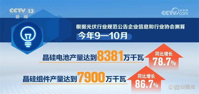 根據(jù)光伏行業(yè)規(guī)范公告企業(yè)信息和行業(yè)協(xié)會(huì)測(cè)算,今年9—10月,全國(guó)多晶硅產(chǎn)量達(dá)到23.66萬噸,同比增長(zhǎng)90%;硅片產(chǎn)量8795萬千瓦,同比增長(zhǎng)61%;晶硅電池、晶硅組件產(chǎn)量分別達(dá)到8381萬千瓦、7900萬千瓦,同比分別增長(zhǎng)78.7%、86.7%。